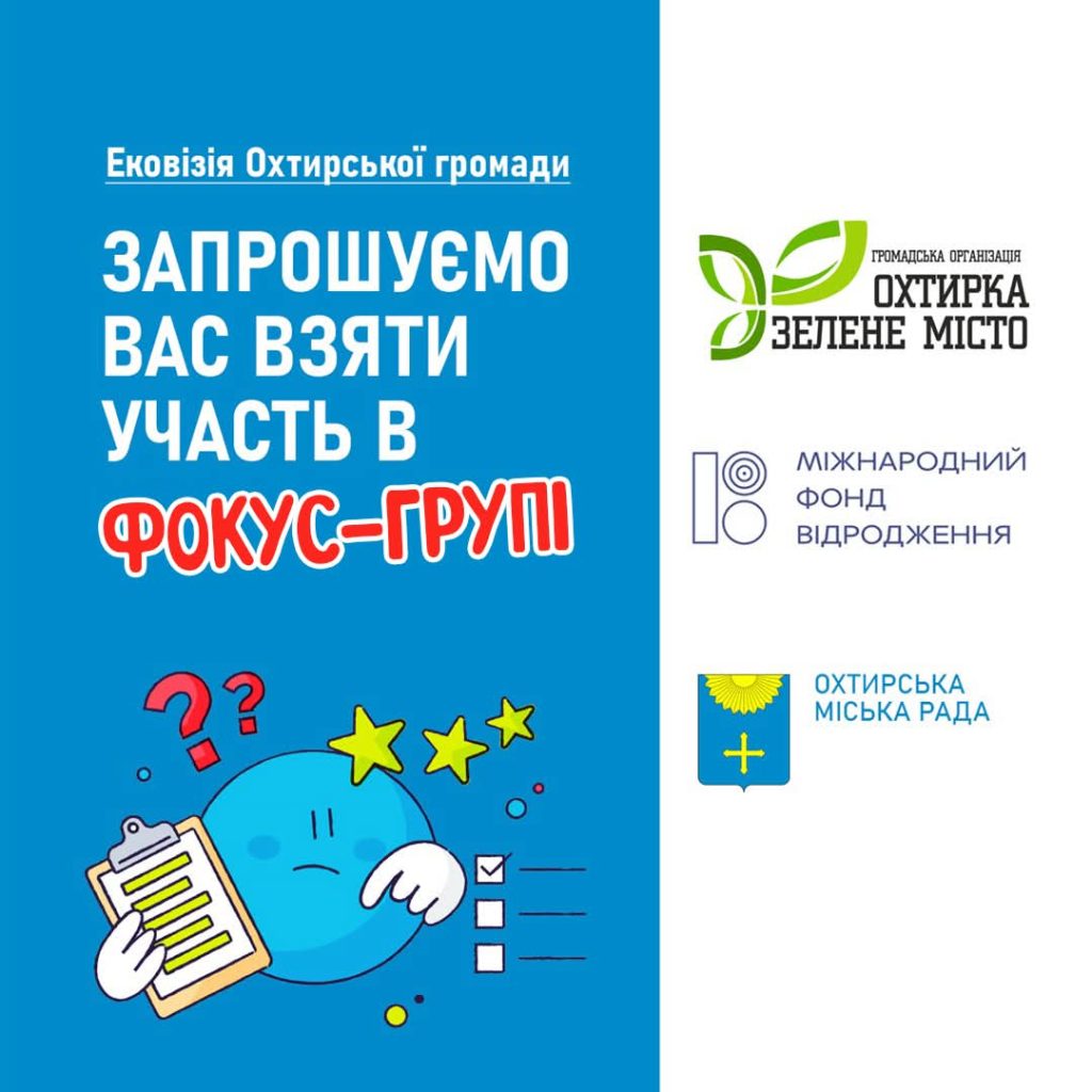 Команда проєкту «Ековізія Охтирської громади: комплексне екологічне планування для сталого майбутнього», що реалізується Громадська організація «Оkhtyrka Zelene Misto” спільно з Охтирською міською радою та фінансується Міжнародним фондом «Відродження», запрошує Вас взяти участь у фокус-групі.